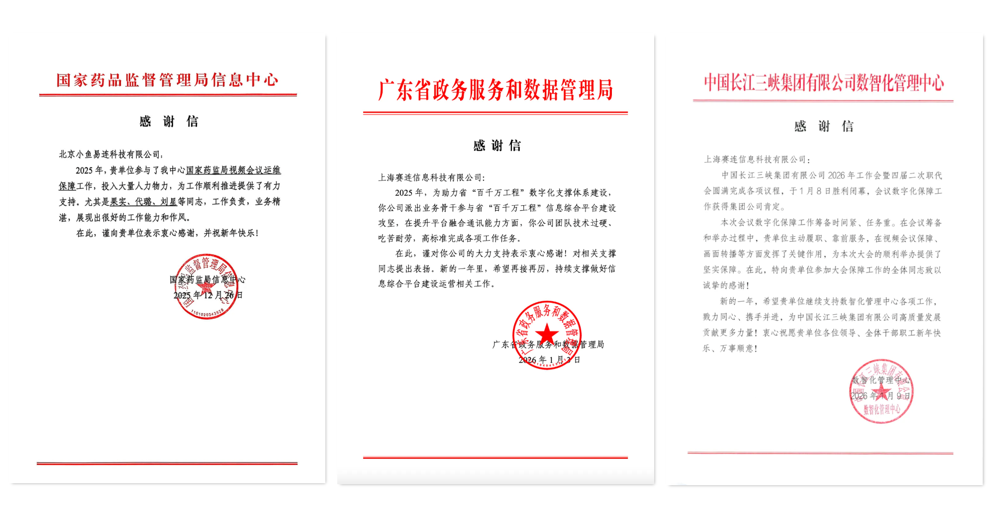 近日,小鱼易连陆续收到来自国家药品监督管理局、广东省政务服务和数据管理局、中国长江三峡集团等重要客户发来的感谢信,高度肯定了小鱼易连在重大项目建设和会议保障中提供的强有力技术支撑和专业服务。这一份份肯定,是信任、是荣誉,更是小鱼易连继续前行的动力。